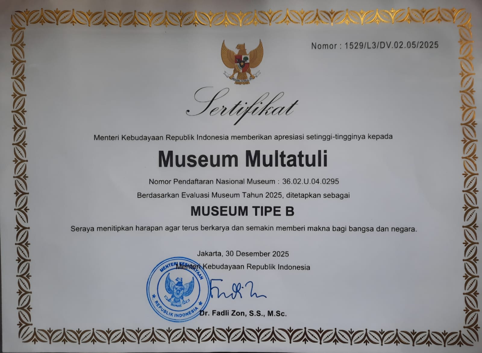RANGKASBITUNG, Museum Multatuli di Kabupaten Lebak kembali mencatat prestasi penting di tingkat nasional setelah ditetapkan sebagai Museum Tipe B oleh Kementerian Kebudayaan Republik Indonesia melalui hasil Evaluasi Museum Tahun 2025. Penetapan ini diumumkan Kamis (22/1/2026) dan disertai sertifikat resmi yang ditandatangani oleh Menteri Kebudayaan RI.
